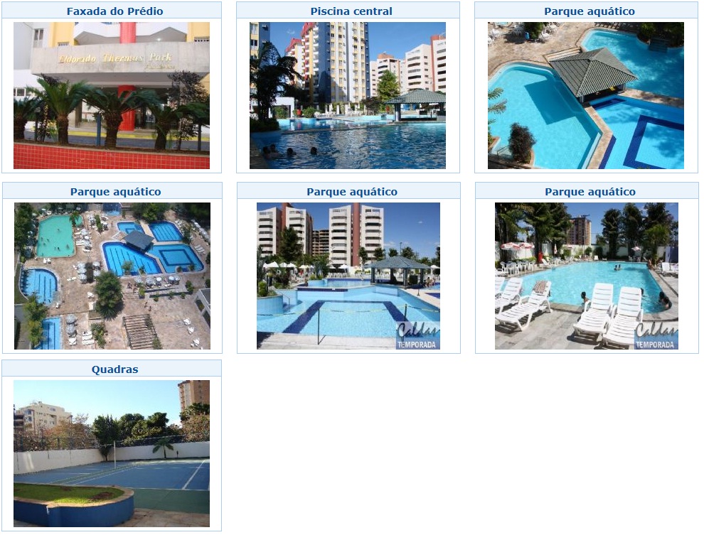 Completa estrutura de lazer com várias piscinas de águas termais servidas por bar quático e piscina fria. Cascatas e Piscina Infantil Termais. Ampla área de banho de sol e Jardins ornamentar. Parque Esportivo com: Quadra polivalente; Quadras de Peteca; Academia de ginástica; Salão de jogos; Sauna a vapor e Sala de Repouso.
